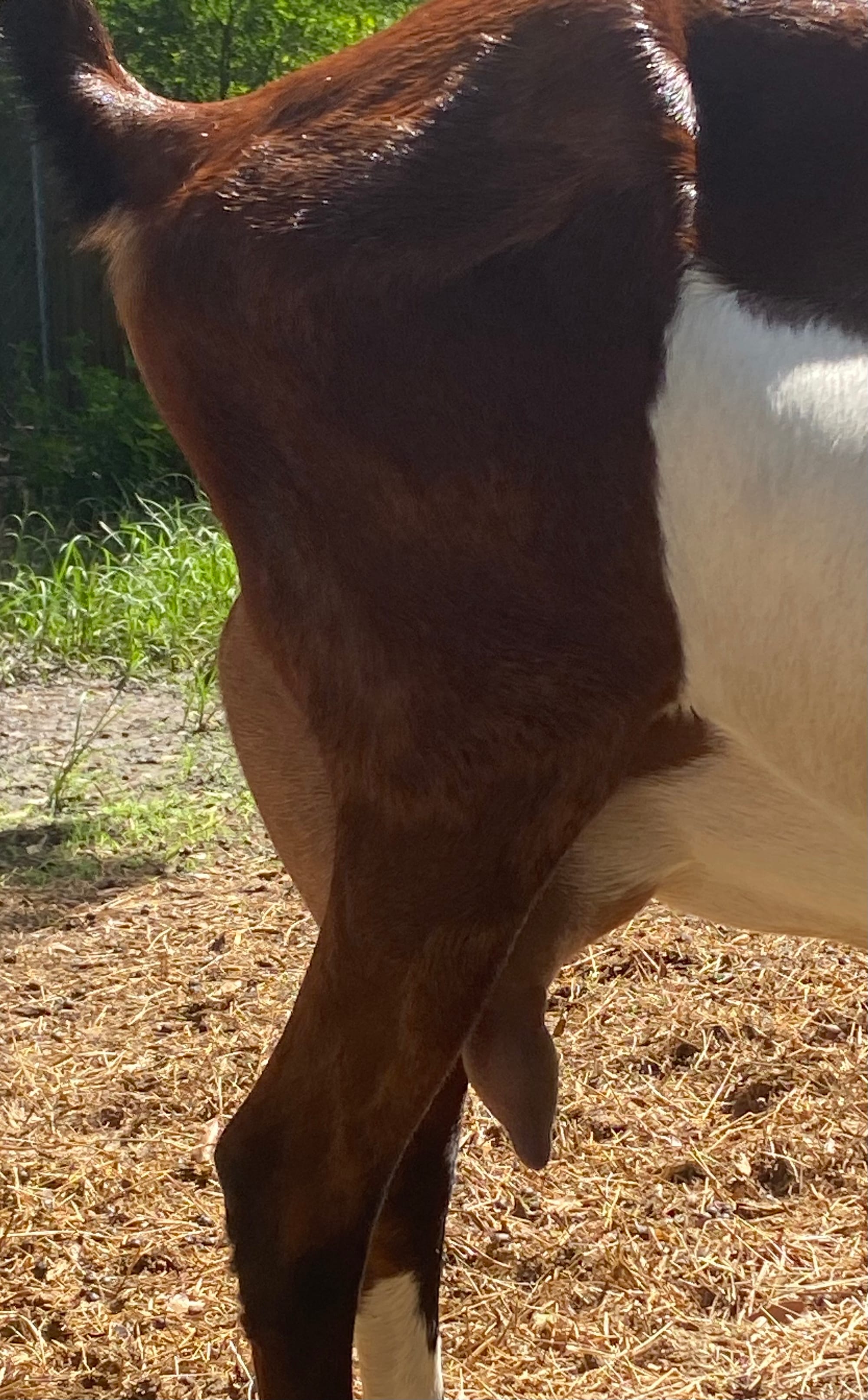 Moogie is a very special doe to me as she is our first homebred doe to freshen on our farm. She earned her dry leg at a show we attended in Corsicana in April 2022. We had not worked with her a whole lot, and we were not very experienced, but the judge really loved her over all appearance and explained later that the choices she made depended upon dairiness. As a milker, Moogie has proven herself to milk consistently throughout her lactation. She is my absolute favorite to hand milk, probably because her udder texture is real nice and empties down to nothing. She has a long neck and very level topline and rump.